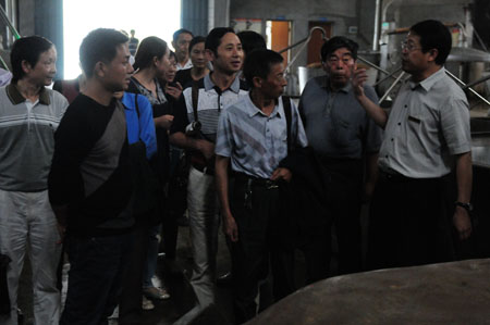 在枝江酒業(yè)黨委書記張華的熱情陪同下,來自問安小學(xué)的教師們參觀了歷史文化展廳、產(chǎn)品展示廳、5萬噸灌裝中心及釀造五車間,深刻了解了枝江酒業(yè)悠久的歷史文化背景,親身感受了酒香四溢、蒸汽環(huán)繞的釀酒場面,品嘗了新釀的熱氣騰騰的枝江原酒。特別在歷史文化展廳,老師們看到栩栩如生的關(guān)廟山模型,感到特別熟悉和親切,因?yàn)殛P(guān)廟山遺址與問安小學(xué)近在咫尺?!安簧砼R其境,感受不到枝江酒釀造的神奇?!痹趨⒂^了釀造五車間之后,一名老師深有感觸地說道。在枝江酒業(yè)多功能廳,老師們還觀看了枝江酒業(yè)社會扶貧宣傳片“心與力的行走”,認(rèn)真、全面地了解了枝江酒業(yè)人的社會責(zé)任擔(dān)當(dāng)和人文關(guān)懷。臨別,盛德剛校長還代表問安小學(xué)向枝江酒業(yè)贈送了“百年枝江,薪火相傳”的書畫作品,他表示,從枝江酒業(yè)的釀酒文化中,受到了觸及心靈的啟發(fā),他們會把這種奮發(fā)向上的精神帶回學(xué)校,植根在孩子們的心靈中。