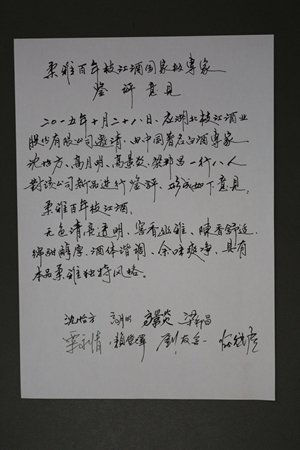 專家們在集體品評了柔雅“枝江王”和柔雅“百年枝江”后,給予了這兩大單品很高的評價。中國釀酒大師、中國白酒專家委員會專家賴登燡先生當場揮毫寫下“韻雅香遠”,還送給枝江酒業(yè)幾幅楹聯(lián):一枝清流融江水,千載風雅醉華夏;枝頭明月清輝籠乾坤,江上春風香醇流千載。行云流水的行草,蒼勁中有清秀,灑脫中有內斂。無論是內容還是筆墨,都與枝江酒的風格相一致,表達了與會專家對枝江酒業(yè)的深情厚誼。
