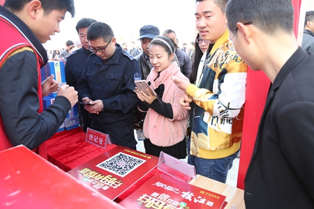 開幕式現(xiàn)場在枝江酒業(yè)展臺參加掃二維碼贈送枝江酒活動的觀眾